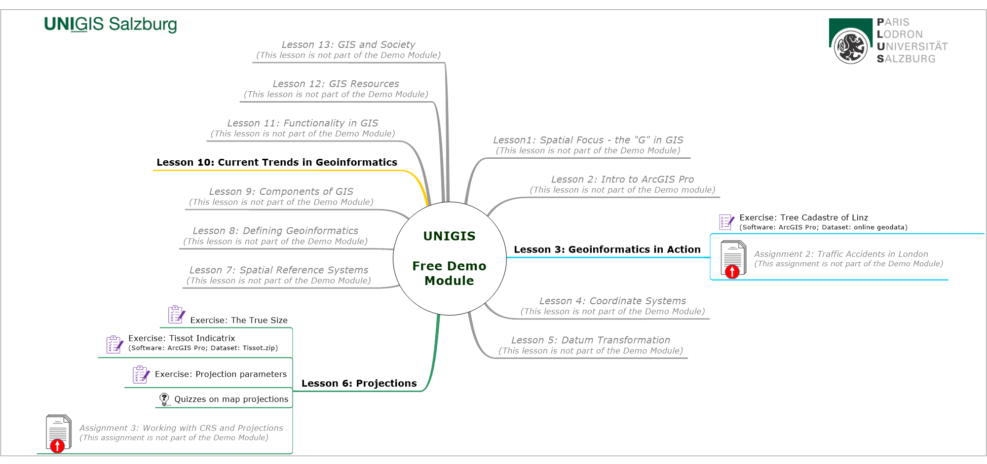 The Demo module consists of 3 (out of 13) publicly accessible lessons from the first module "Introduction to Geoinformatics". It will take you about two evenings to work through these lessons.