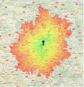En la Figura 1.3, puede ver categorías de tiempos de viaje vinculados a la red. Cada categoría equivale a 8 minutos de viaje. Mientras que esperaríamos amortiguar de forma circular para las distancias euclidianas, ahora obtenemos líneas distorsionadas de tiempos de viaje iguales, también conocidos como “isócronas”.