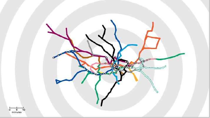 El tiempo de viaje (Travel Time Tube; Figura 1.4) de Londres lleva el principio de las isócronas (más conocido en SIG como Isochrones) a sus extremos: distorsiona el espacio para adaptarse a las isócronas. ¡Échale un vistazo! (Revisa el material adicional para saber más sobre éste tema).