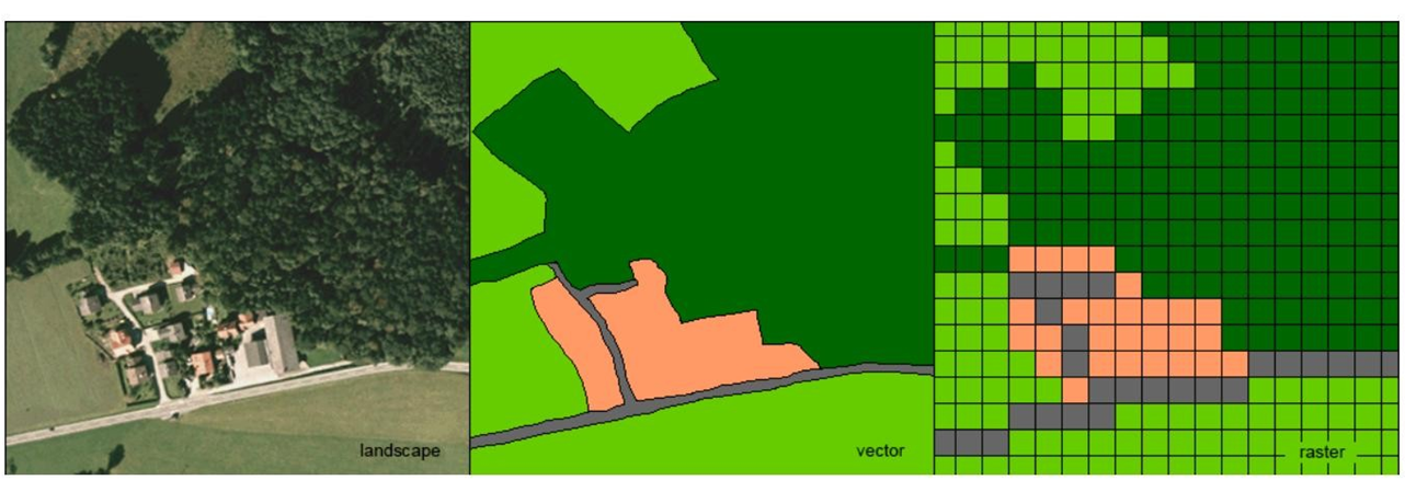 Hay dos posibilidades de cómo podemos pensar sobre las entidades en el espacio geográfico: ya sea como campos continuos o como objetos discretos. Si bien vemos la topografía, ¡ojo! No topología general de un paisaje, como una superficie continua, podemos identificar pueblos individuales, ríos o campos de maíz dentro de ese paisaje. En la vista de objetos identificamos objetos discretos con límites nítidos: casas, calles, ríos y montañas. Esta es la visión predominante, cuando pensamos en el mundo. En un primer paso identificamos el objeto, luego lo llenamos con atributos y lo ubicamos. Dentro de su extensión, un objeto es homogéneo; sus atributos no varían dentro del objeto. La geometría euclidiana describe las cuatro categorías de objetos espaciales: puntos, líneas, polígonos y sólidos.