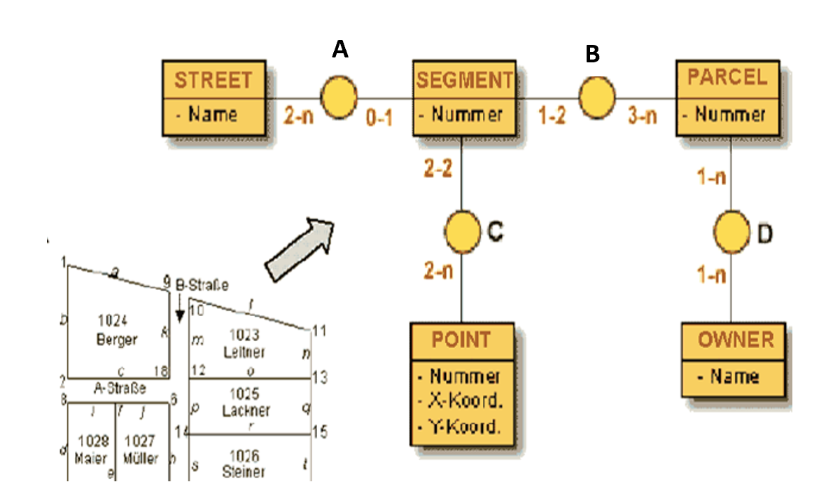 En este paso, pasamos de lo real al mundo virtual. Basados en el modelo conceptual, los modelos de datos espaciales definen las propiedades y relaciones de los objetos digitales. Al diseñar un modelo de datos, podemos hacer preguntas como “¿representaremos una ciudad como un conjunto de celdas adyacentes en un ráster que comparten el mismo atributo de uso del suelo, como una entidad poligonal o como un punto?”. La notación clásica que describe los modelos de datos son los diagramas de entidad-relación (ER). Frank (1992) distingue entre cinco modelos principales de datos espaciales. Todos ellos tienen ubicación, propiedades geométricas e información de atributos opcionales, algunos también contienen información topológica:
