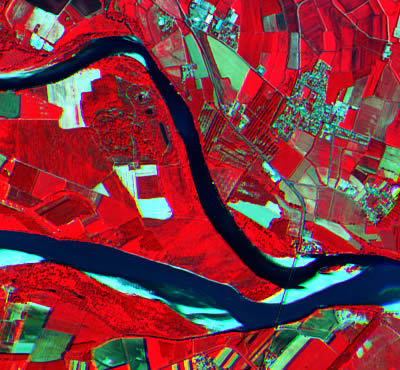 Una escena de imagen satelital suele constar de varios canales que se graban al mismo tiempo. En cada canal, la radiación reflejada o emitida por la superficie terrestre se convierte en valores digitales en un rango específico del espectro electromagnético. Así, es posible obtener nueva información combinando o editando los canales originales. Los canales se combinan asignando las intensidades registradas en cada banda de un sensor a uno de los colores de la gama visible del espectro (azul, verde, rojo) para mostrar la imagen en una pantalla. Cuando se utilizan las bandas correspondientes a los colores respectivos (es decir, la luz roja reflejada se muestra roja en la pantalla, la banda verde se muestra verde y la banda azul, azul), el resultado es una imagen en color verdadero. Sin embargo, y a menudo incluso más interesante para el análisis de datos de teledetección, son las longitudes de onda más allá del espectro visible de la luz. Por ejemplo, para detectar en color la vegetación activa (que refleja específicamente en el espectro del infrarrojo cercano, como ya hemos oído), la banda del infrarrojo cercano se muestra en rojo en una imagen en falso color (véase la Figura 2.3).