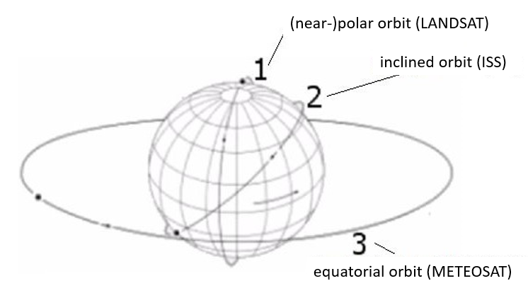 Los satélites meteorológicos suelen ser satélites geoestacionarios en los que la plataforma está situada a una altitud de unos 36.000 km sobre el ecuador y se desplaza con la Tierra a la velocidad de una órbita al día. Debido a la gran distancia a la superficie terrestre, se puede tomar a intervalos cortos una imagen (de resolución comparativamente baja) de todo un hemisferio visible desde el satélite. En las órbitas polares, el satélite orbita la Tierra de polo a polo a unos cientos de kilómetros de altura. Sin embargo, lo más frecuente es que el plano orbital esté ligeramente inclinado con respecto al eje de rotación (órbita casi polar). Las órbitas heliosincrónicas son órbitas casi polares, en las que el satélite pasa sobre cualquier punto de la superficie del planeta a la misma hora local. Esto facilita la comparación de observaciones de procesos en la Tierra realizadas en días diferentes, ya que el ángulo de incidencia del sol y, por tanto, las características de reflexión de la superficie no cambian. Los satélites LANDSAT son un ejemplo destacado de órbitas casi polares sincronizadas con el sol (véase la Figura 2.8).