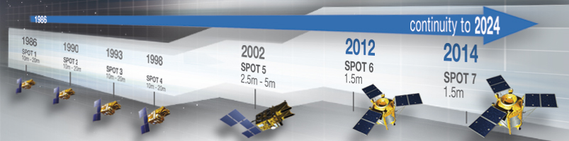 Durante mucho tiempo, el programa francés SPOT (Système Pour l’Observation de la Terre) fue la única alternativa a LANDSAT para obtener datos de teledetección por satélite óptico de resolución aceptable. El primer satélite francés, SPOT-1, se lanzó en 1986 (véase la Figura 2.11). En la actualidad, SPOT 6 (lanzado en 2012) y SPOT 7 (lanzado en 2014) siguen operativos. Mientras que SPOT 1-4 tenía una resolución pancromática (espacial) de 10 m (¡en 1986 eso era realmente sensacional!), SPOT 5 ya proporcionaba una resolución espacial de 2,5 m, y SPOT 6 y 7 una resolución de 1,5 m (6 m en la gama multiespectral).