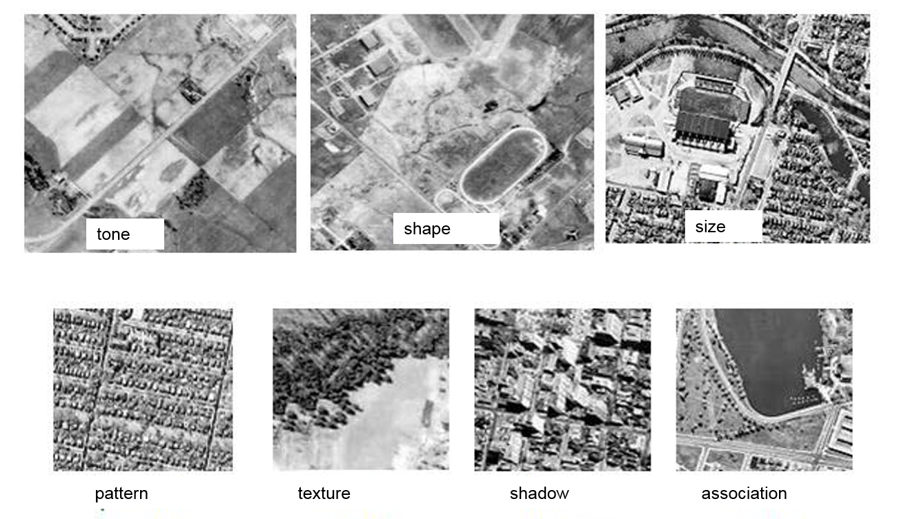La percepción visual de los objetos desempeña un papel importante en el análisis de imágenes. Sin embargo, esto supone que el intérprete de imágenes tiene algún tipo de conocimiento sobre los objetos que deben analizarse en una imagen. Así, antes de poder procesar la información (temática) inherente a un objeto, hay que describir con precisión su aspecto mediante la definición de los siguientes parámetros visuales del objeto: tono, forma, tamaño, patrón, textura, sombra y contexto (véase la Figura 2.14).