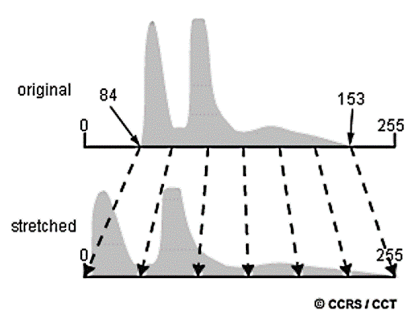 El objetivo de la mejora de imágenes es mejorar el aspecto (visual) de una imagen para su posterior interpretación y análisis, mediante métodos que nos permitan distinguir entre los objetos (o características) de una escena de imagen de forma más sencilla. Esto es especialmente importante para la interpretación visual de imágenes. La mejora del contraste es una herramienta muy potente que altera los valores originales de las imágenes en bruto utilizando toda la gama de valores digitales disponibles (256 niveles de color en el modelo RGB). Utiliza un histograma que representa gráficamente la frecuencia de todos los valores de gris individuales (0-255) en una escena de imagen. En los datos de la imagen original, los valores de gris suelen estar limitados a una determinada gama y muchos de los 256 valores de brillo posibles sólo aparecen raramente o ni siquiera aparecen, lo que reduce considerablemente el contraste de la escena. Por ello, mediante la mejora del contraste, los valores de gris de la escena se transforman en una nueva escena de mayor contraste aplicando un contraste lineal o ecualizado por histograma o un estiramiento del histograma (véase la Figura 2.15).