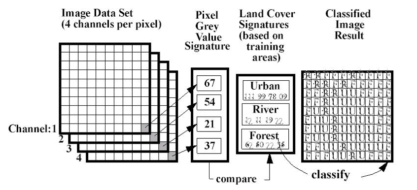 Este enfoque se basa en la idea fundamental de que las diferentes clases de objetos (por ejemplo, agua, bosques, praderas) tienen propiedades espectrales específicas (reflejan, absorben y transmiten proporciones diferentes de energía electromagnética), que se registran en diferentes canales espectrales de un sensor de teledetección. El ráster resultante puede utilizarse para crear mapas temáticos de clases de ocupación o uso del suelo. Mientras que los objetos de una escena de imagen (muy) pequeña pueden detectarse e interpretarse manualmente (por ejemplo, mediante la digitalización de estos objetos en el fondo de la imagen), las técnicas automatizadas de clasificación de imágenes se utilizan para analizar escenas más grandes.