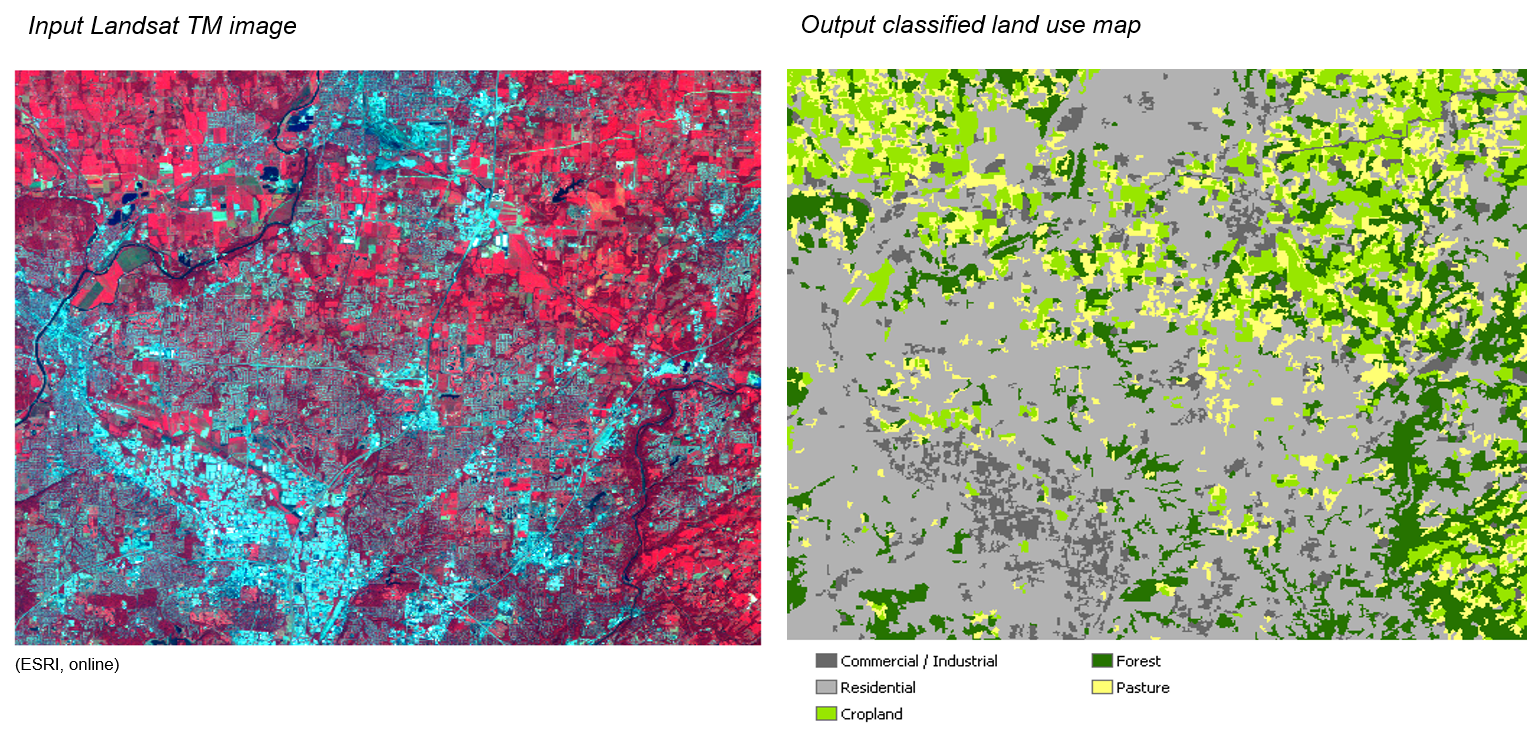 - Definición de cinco clases de uso del suelo (comercial/industrial, residencial, tierras de cultivo, bosques y pastos) en la imagen de satélite sin procesar (imagen Landsat TM de cuatro bandas).