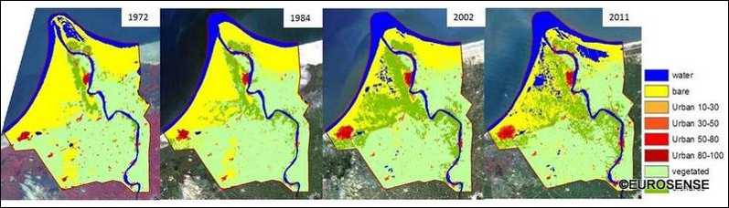 Eche un vistazo a este sitio web, que compara dos imágenes de satélite de diferentes años y los cambios en los patrones de urbanización a lo largo del tiempo.