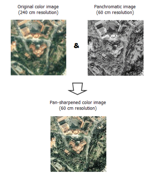 Por ello, muchas plataformas de satélites disponen de un canal pancromático adicional que cubre una amplia gama del espectro electromagnético (por ejemplo, toda la luz visible) y, por tanto, proporciona imágenes de alta resolución espacial. El proceso de enfoque panorámico (que explicaremos más adelante) aprovecha este canal adicional.