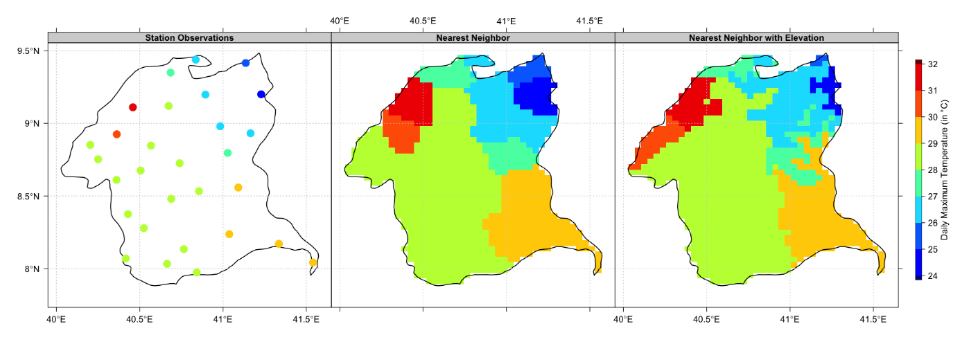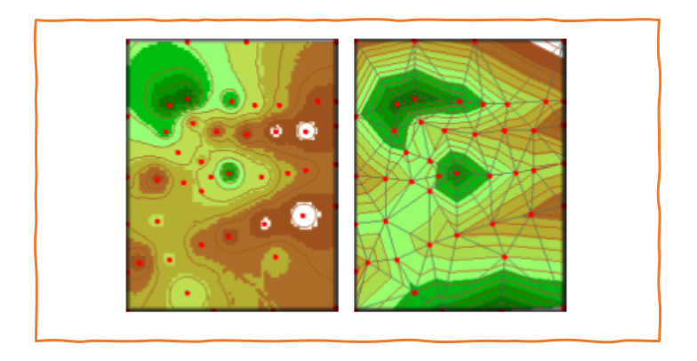 Hay dos casos en los que el vecino más cercano es la mejor (y única) opción para llegar a una superficie a partir de mediciones puntuales. Primero, en casos en los que el atributo de interés es nominal. En segundo lugar, donde el fenómeno de interés es discreto y no cambia de forma continua en la superficie. Esto es más probable que sea el caso de los datos en escala ordinal. En la Figura 5.7, los autores del estudio argumentaron que se eligió la interpolación por el vecino más cercano, porque la aparición de la helada es un fenómeno discreto que está principalmente gobernado por el sombreado topográfico local.
