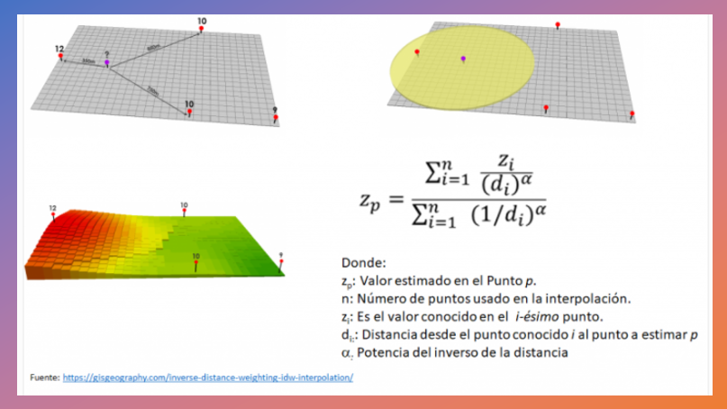 - La ponderación de estos puntos de medición inversos a la distancia: mientras más pequeña la distancia del punto de medición, más alta su ponderación.