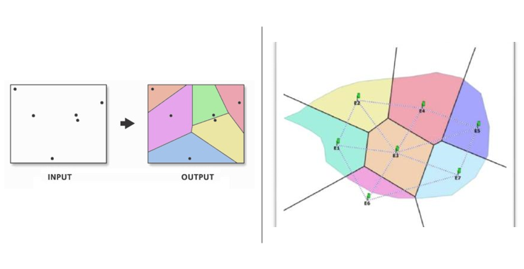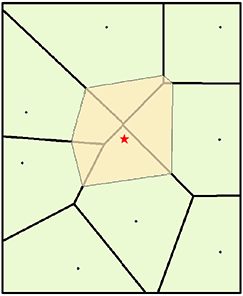 Si los valores recolectados son a nivel nominal, el cálculo de su valor medio no tiene sentido. En estos casos la técnica de los Polígonos Thiessen puede ser aplicada: para cada punto que su valor necesite ser estimado solo su punto vecino es considerado y su valor medio es adoptado. Una interpolación así está basada en el criterio del vecino más cercano (ver Figura 5.4).