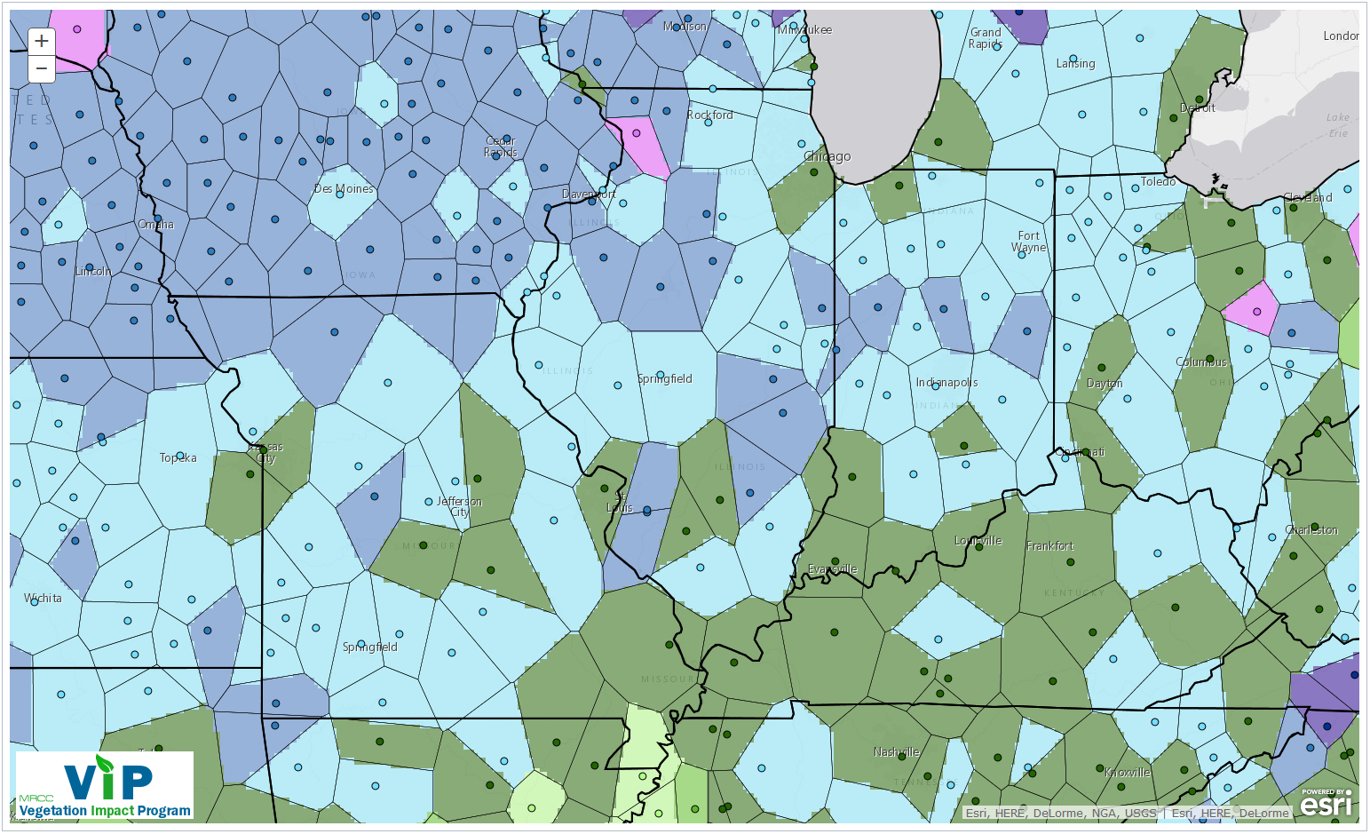 La interpolación por el vecino más cercano es una interpolación local que asume que el valor estimado toma el valor del punto de muestra más cercano. La superficie resultante son los polígonos de Thiessen que ya hemos visto cuando discutimos el análisis basado en la distancia. Un ejemplo de interpolación por el vecino más cercano se da en la Figura 5.7, que mapea la aparición de la helada invernal en Illinois, EE.UU.