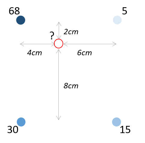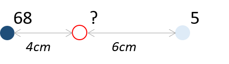 El valor resultante de una interpolación lineal entre los dos puntos vecinos es una media ponderada, donde los pesos se derivan de la distancia inversa entre la ubicación de la muestra y el punto interpolado. Aquí, es el 60% del valor 68 y el 40% del valor 5: