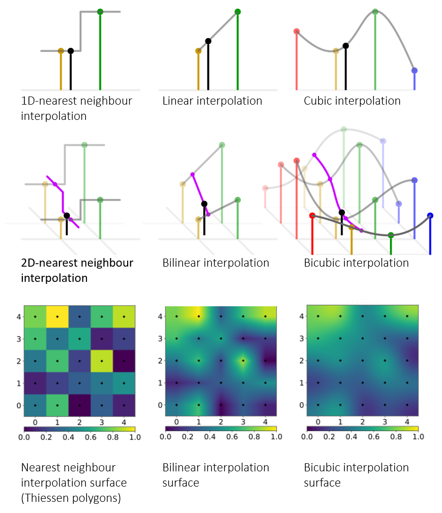 La interpolación bilinear produce transiciones bruscas en los puntos de muestra. Para evitar discontinuidades abruptas, la interpolación bicúbica ofrece una alternativa (visualmente) más agradable con transiciones continuas. En este enfoque, se ajustan ecuaciones polinomiales a los puntos. La Figura 5.11 visualiza la interpolación bicúbica en comparación con las técnicas de vecino más cercano y bilinear.
