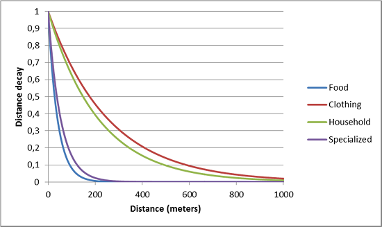 Muchos fenómenos están gobernados por efectos de decaimiento de la distancia no lineales, como por ejemplo la intensidad del ruido o las distancias de viaje de los clientes a las tiendas de comestibles. Para tener en cuenta el fenómeno específico que un analista quiere interpolar, la distancia inversa se puede calcular a una potencia. Cuanto mayor sea el parámetro de potencia, más brusca será la caída a lo largo de la distancia. La Figura 5.13 muestra un ejemplo del efecto de decaimiento de la distancia para cuatro sectores minoristas (Klaesson y Öner 2014).
