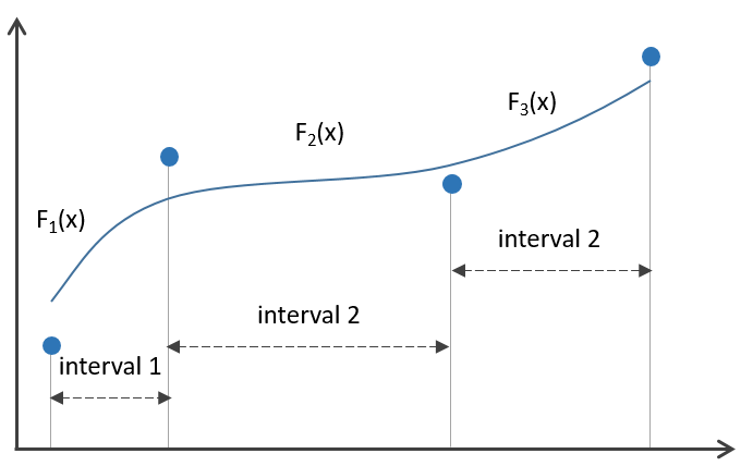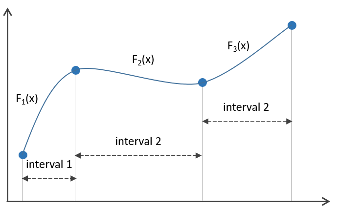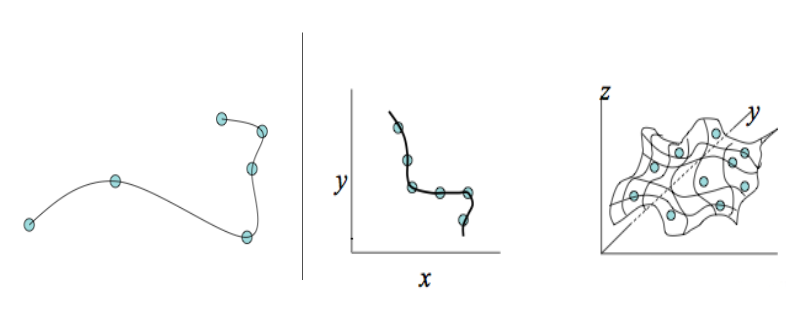 Matemáticamente, una spline es una ecuación polinomial en trozos, como se representa en la Figura 5.18, donde las splines cúbicas usan ecuaciones polinomiales de tercer orden. Esto significa que no hay una sola ecuación polinomial que tenga que pasar por todos los puntos a la vez, sino que hay varios polinomios apilados: uno para cada segmento entre los puntos de muestra. El resultado es una superficie lisa sin sobresaltos.