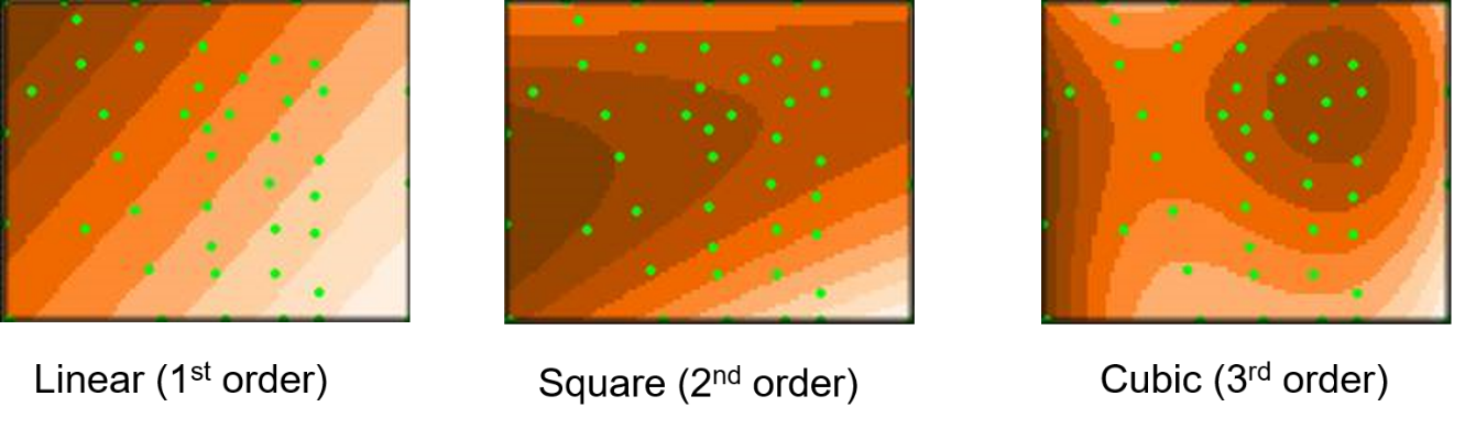 Las superficies de tendencia se calculan ajustando una ecuación polinomial para todos los puntos de muestra en una interpolación aproximada. Dependiendo del orden de la ecuación polinomial, la superficie de tendencia puede ser lineal, cuadrada o cúbica (Figura 5.22). En teoría, también son posibles polinomios de orden superior, pero se desaconseja encarecidamente su uso. Los polinomios de cuarto orden o más altos son propensos a generar picos extremos incorrectamente, especialmente cerca del límite o en áreas con poca densidad de muestreo.