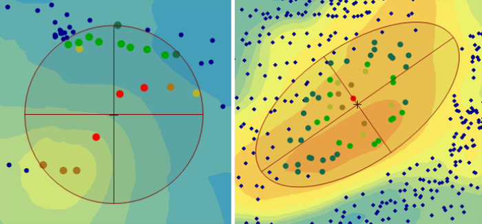 Si los datos que queremos interpolar son anisotrópicos, es importante tener en cuenta la distribución de los puntos. En tales casos, tenemos que estirar el eje de búsqueda a lo largo de la dirección del fenómeno y dividir aún más el vecindario de búsqueda en sectores direccionales para obtener buenos resultados (Figura 5.24). El vecindario debe ser lo suficientemente grande como para garantizar que haya un número mínimo de puntos de muestra disponibles para parametrizar cada cuadrante individual.