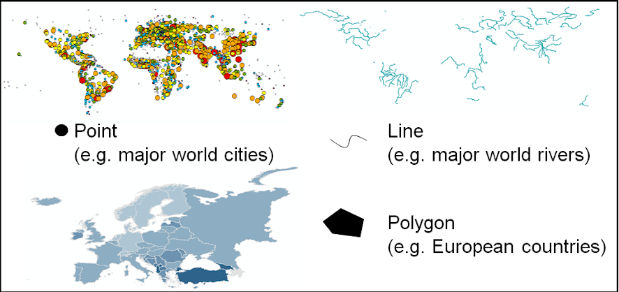 - Polígono: representación bidimensional de objetos de área (por ejemplo, límites de países, uso de la tierra)
