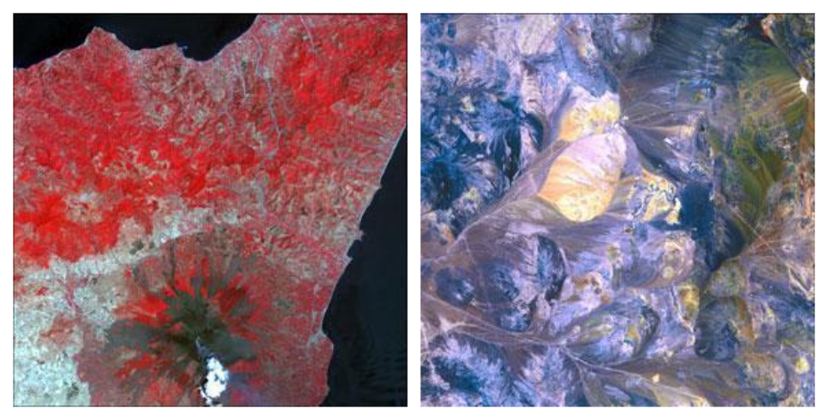 En la Figura 3.3 vemos representadas Imágenes del satélite LandSat-7. Interpretar la información que ofrecen no siempre es fácil. A la izquierda el Mt. Etna, situado en la isla italiana de Sicilia, uno de los volcanes más activos del mundo. En esta imagen del 2001 se observa el volcán en erupción, la salida de humo del cráter y el avance de lava oscura por sus pendientes. En la imagen de la derecha vemos el desierto de Atacama, en el norte de Chile, uno de los más secos en el pie de los Andes. Aquí confluyen pequeños lagos de sal con sedimentos minerales que dan lugar a volcanes blancos.