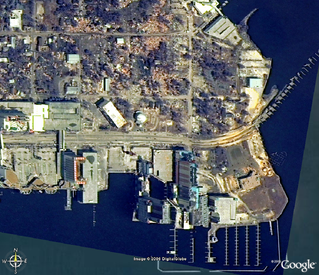 Un ejemplo de ello es el uso de herramientas como Google Earth en el transcurso del huracán Katrina. En la figura 10. podemos ver imágenes de Google Earth del antes y después del paso del huracán Katrina en Nueva Orleans. Durante las primeras semanas del huracán Katrina, Google Earth fue utilizado por la población local, para visualizar la situación de la ciudad. Posteriormente ha servido para compartir información de la clasificación de las zonas afectadas por el paso del huracán. Con tales temas explosivos, en los que la actuación o la falta de actuación provocan consecuencias amplias, que eventualmente también deciden sobre la supervivencia de personas, hay que determinar de antemano la actualidad, exactitud, responsabilidad, las consecuencias jurídicas, etc. de los datos.