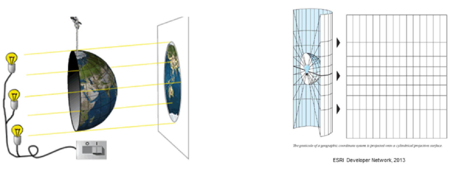 El concepto de proyección de un mapa puede imaginarse como una proyección de luz (Figura 1). Si pusiéramos una bombilla emitiendo luz en un globo translúcido y proyectáramos la imagen en una pared, obtendríamos una proyección del mapa. Y así, en lugar de proyectar una luz, los cartógrafos utilizan las fórmulas matemáticas para crear las proyecciones.