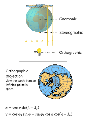 Las proyecciones cónicas y cilíndricas generalmente usan una fuente de luz que emana del centro de la Tierra. En las proyecciones azimutales (planar) se pueden ver claramente los efectos del uso de fuentes de luz en diferentes posiciones, especialmente en las proyecciones polares. Se puede ver que, en la proyección gnomónica, la mayoría de las latitudes / paralelos no son visibles en absoluto, pero los grandes círculos se representan como líneas rectas. La proyección ortográfica, por otro lado, casi se asemeja a la visión que un geógrafo esperaría al ver la Tierra desde el espacio.