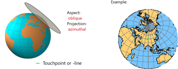 El aspecto de proyección del mapa se refiere al punto o línea (s) de tangencia en la superficie de proyección (Figura 4.12). En teoría, puede tocar o intersectarse en cualquier lugar de la superficie de proyección. La calidad de una proyección es mejor cuando la superficie de proyección toca la superficie de la Tierra. Por ejemplo, una proyección azimutal en la que el plano de proyección toca la Tierra en o cerca del polo norte da como resultado proyecciones significativamente mejores para las áreas cercanas al polo que las regiones ecuatoriales. En contraste, una proyección cilíndrica tangencial al ecuador es mejor para las áreas ecuatoriales que para una región polar.