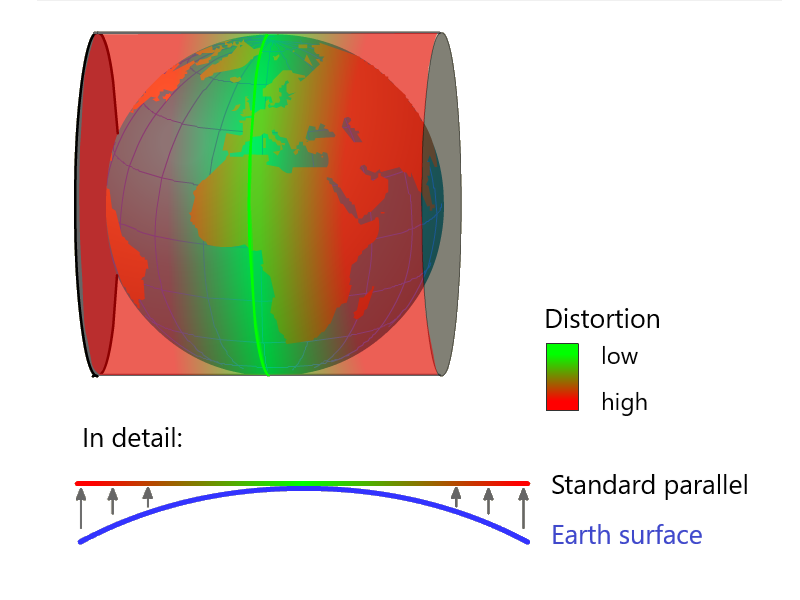 ¿Cómo es que los mapas a gran escala altamente precisos se basan en una proyección cilíndrica? Por ejemplo, en Europa estamos bastante lejos del ecuador. Para proyectar cualquier parte (pequeña) de la superficie de la Tierra en alta calidad, cambiamos la posición del cuerpo de proyección (geométrico) en relación con la Tierra. Por ejemplo, con un cilindro horizontal, incluso las áreas fuera de la zona ecuatorial se representan con suficiente precisión. De esta manera es posible distinguir tres aspectos de la proyección: