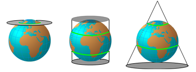 Ubicación de la zona a proyectar. Principalmente para mapas de mediana y pequeña escala, la siguiente regla general resulta de cómo la superficie de proyección se ajusta al cuerpo de la Tierra: