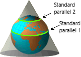Paralelo estándar / Latitud de escala verdadera es la línea de latitud en una proyección cónica o cilíndrica en aspecto normal donde la superficie de proyección toca el globo. Una proyección cónica tangente o cilíndrica tiene un paralelo estándar, mientras que una proyección cónica o cilíndrica secante tiene dos. En el paralelo estándar, la proyección no muestra distorsión. En la Figura 4.18 se visualiza una proyección cónica con dos paralelos estándar.