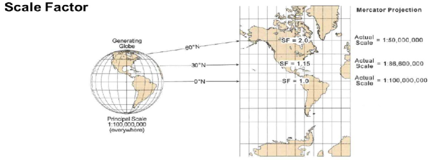 Por ejemplo, \(SF = 1.15\) en un mapa regional significa que la escala real es un \(15\%\) mayor que la escala principal. \(SF = 2\) significa que la distancia es dos veces mayor, mientras que \(SF = 0.5\) significa que la distancia es la mitad de la distancia real.