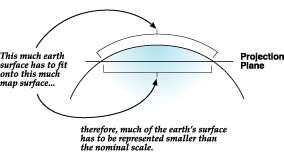 Proyecciones diferentes causan tipos diferentes de distorsiones. Algunas proyecciones son diseñadas para reducir al mínimo la distorsión de una o dos de las características de los datos. Una proyección podría mantener el área de un elemento, pero cambiar su forma. En la Figura 4.20, los datos próximos a los laterales son estirados, los rasgos tridimensionales son comprimidos para caber en una superficie plana.