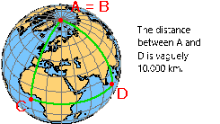 Observe el siguiente acertijo en la Figura 4.24: La distancia entre los puntos A y C y entre C y D es de aproximadamente 10,000 kilómetros respectivamente. ¿Cuál es la distancia entre A y D?