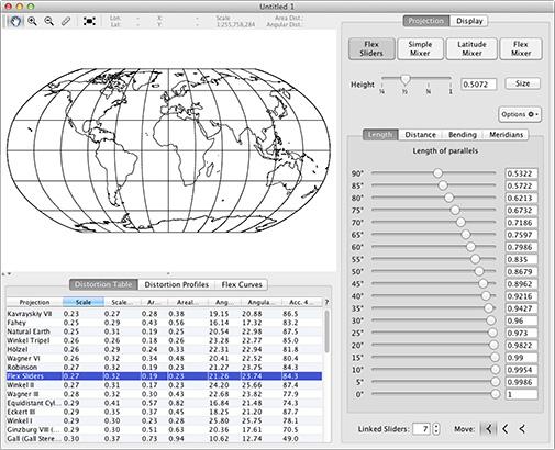 Para recrear cada una de las diferentes proyecciones vistas arriba y muchas otras más, así como desplegar las indicatrices de Tissot bajo diferentes proyecciones, le invitamos a descargar el aplicativo FlexProjector. Esta es “una aplicación de software gratuita, de código abierto y multiplataforma que permite a los cartógrafos diseñar de forma interactiva proyecciones personalizadas para mapas mundiales a pequeña escala. Se especializa en proyecciones cilíndricas y pseudocilíndricas, así como en proyecciones policónicas con paralelos curvos. Dar a los meridianos una separación no uniforme es una opción para todas las clases de proyecciones. Desde la interfaz de FlexProjector (Figura 4.35), se permite a los cartógrafos dar forma a la retícula de proyección y proporciona información visual y numérica para juzgar sus propiedades de distorsión. Los usuarios previstos de FlexProjector son aquellos sin conocimientos matemáticos especializados, incluidos los cartógrafos en ejercicio y los estudiantes de cartografía”. Una vez descargado simplemente corra el ejecutable e inicie con el comando CTRL-R y CTRL-I para visualizar más de 60 proyecciones junto con los círculos de Tissot.