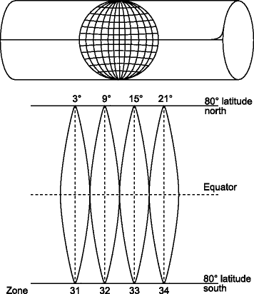 El sistema UTM se basa en una figura de cilindro transversal conforme. Sin embargo, a diferencia del sistema Gauss-Krüger, UTM utiliza un cilindro secante, lo que resulta en una calidad de mapeo comparable al duplicar el ancho de la zona a 6 grados (6 °) de longitud. De esta manera, toda la Tierra puede cubrirse entre 84° N y 80° S con (sólo) 60 meridianos, es decir, 60 zonas UTM. Como se muestra en la Figura 4.40, las zonas están numeradas de oeste a este, por ejemplo, la zona 1 comienza a 180 ° W y la zona 60 se extiende desde 174 ° E hasta la Línea internacional de referencia. Debido al estrecho ancho de la zona, las regiones al norte y al sur y las áreas de la capa de hielo polar se mapean en la proyección estereográfica polar universal (UPS) conforme.