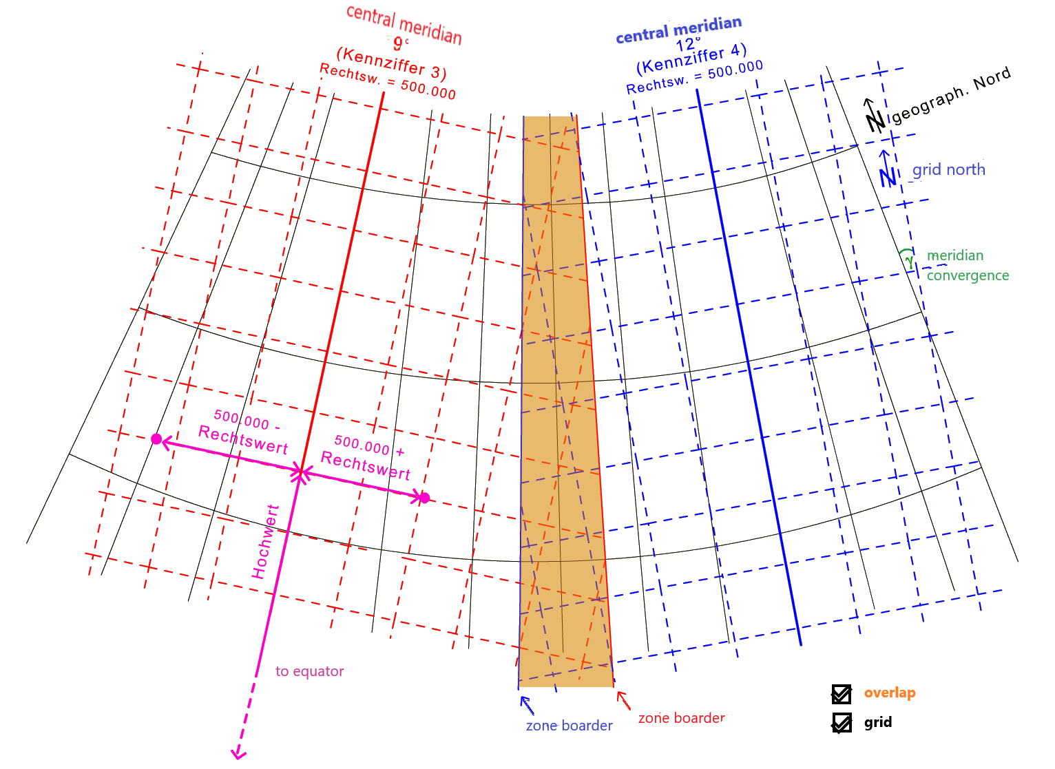 A continuación, dos sistemas principales, Gauss-Krüger y UTM, se describen en su forma general. Luego, se ofrece una breve reseña de las posibles modificaciones de estos sistemas y otros sistemas oficiales de referencia en la región de habla alemana.