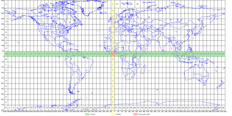 La numeración de los meridianos comienza en la línea de fecha y va desde la zona 1 (180°W - 174°W) hasta la zona 60 (174°E - 180°E) (referir a la Figura 4.40). Para una mejor ubicación de un área dentro de una zona, cada zona UTM se divide horizontalmente en 20 bandas de latitud, donde cada banda de latitud tiene 8 grados de altura. La única excepción se puede ver en el área más remota de la Tierra, que se extiende 4 grados adicionales para terminar a 84 ° N (es decir, 72-84 ° N). Las bandas de latitud se escriben a partir de 80 ° S con la letra “C” hasta “X” en un orden alfabético. Las letras “I” y “O” se omiten porque se parece a los números 1 y 0. La intersección entre zonas y campos se denomina campo de zona.