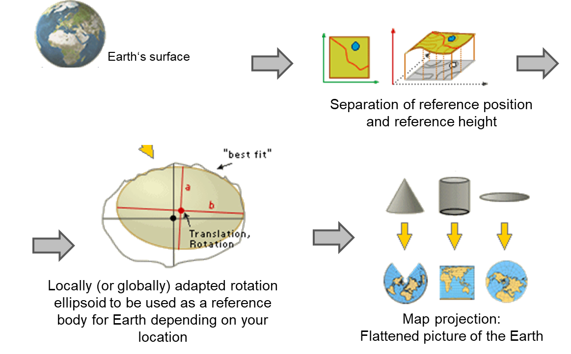 En Austria y Suiza, la topografía es llevada a cabo por las respectivas organizaciones federales (a menudo denominadas autoridad nacional de topografía) cuya tarea consiste en definir el sistema de referencia espacial preferido a nivel nacional. En Alemania, por otro lado, un sistema de referencia espacial para la topografía es responsabilidad de los estados federales individuales. Después de la reunificación alemana, se descubrió que existían varios sistemas de referencia espacial diferentes, lo que dificulta la integración de datos de diferentes fuentes.