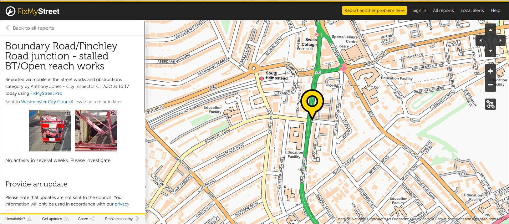FixMyStreet. Esta aplicación británica (Figura 8.6) ofrece una interfaz a la institución gubernamental responsable para informar de los daños en las carreteras y hacer que se reparen. Esta plataforma, que se ha hecho popular gracias a la colaboración con un diario, cuenta con unos 3.000 informes semanales. FixMyStreet es algo más que una plataforma de notificación de carreteras dañadas, ya que muchas publicaciones son motivo de debate sobre la ordenación del territorio y la eficacia de las autoridades locales.