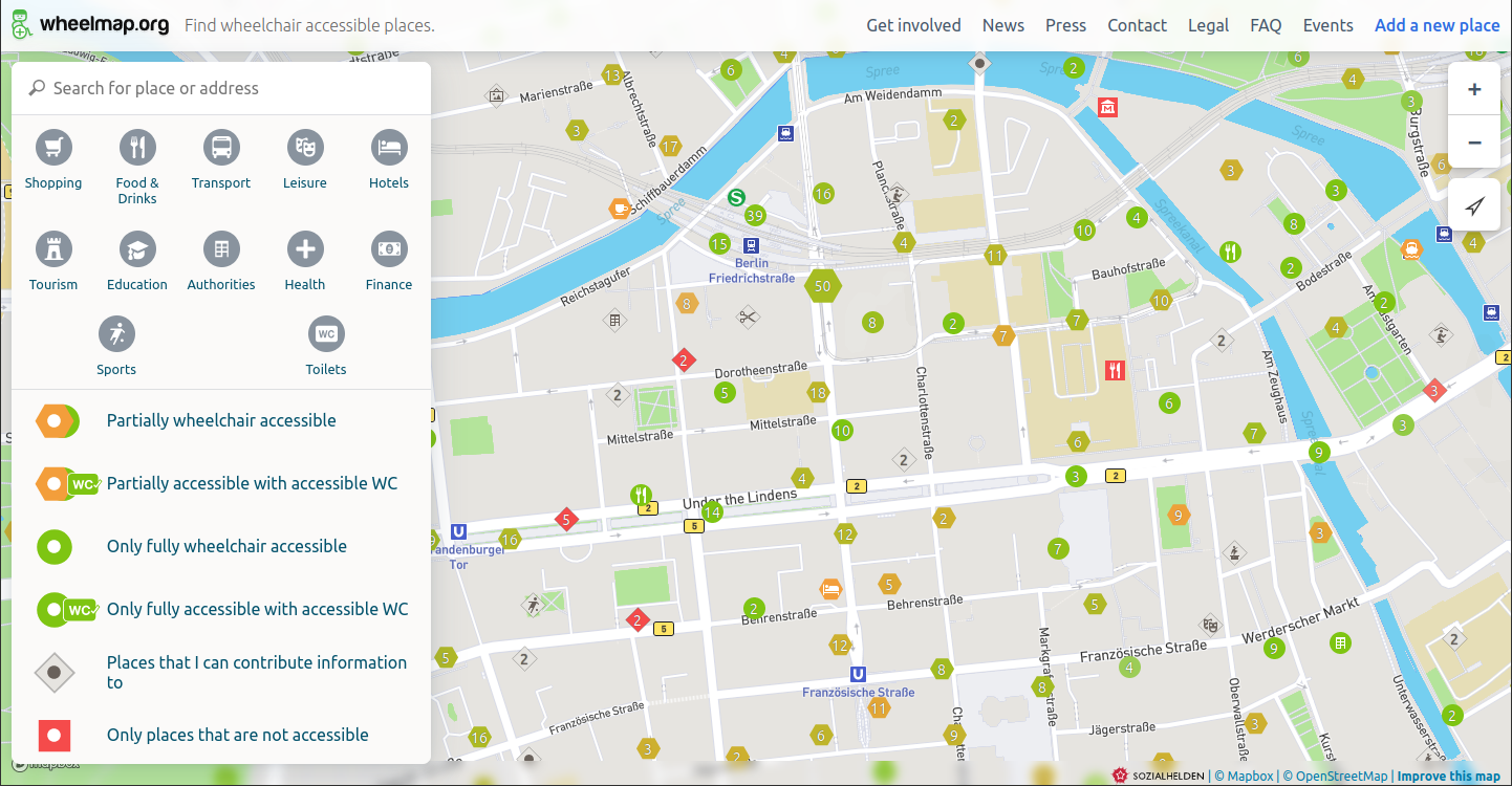 El mapeo colaborativo posibilita la pluralización de las representaciones de las concepciones espaciales y de los mundos de la vida cotidiana de las personas. Si la producción de mapas hasta ahora estuvo ligada a instituciones y empresas estatales, ahora cada persona puede participar en la producción de un mapa. Así se torna cada vez más fácil también producir mapas que representan los mundos de la vida de “minorías” y que se ocupan de sus necesidades especiales. Un ejemplo es el proyecto www.wheelmap.org, un mapa en el que se marcan lugares aptos para silla de ruedas (Figura 8.7).