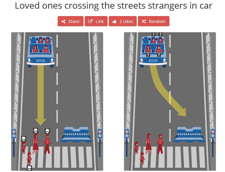 Cómo la sociedad influye en el software y cómo éste influye en la realidad puede verse en el debate sobre los coches autónomos. En este caso, un programador tiene que prever todas las posibles situaciones que puede “experimentar” un coche y encontrar reglas de decisión para resolverlas. El Proyecto Máquina Moral del MIT describe claramente este dilema, como se muestra en la Figura 8.10.